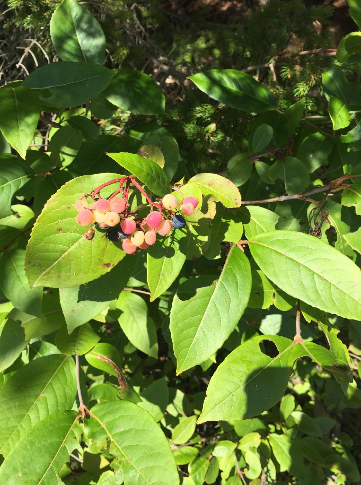 A shrub with exquisite color changes as they ripen (in my opinion) is Nannyberry (Viburnum lentago). Some call it wild raisin, probably because the pulp of the fruit tastes a bit like raisins or dates. When ripe, the berries turn blue-black and can be cooked or made into jelly after removing the seed. This is one of the shrubs that hold onto their berries into the winter providing food for the birds.