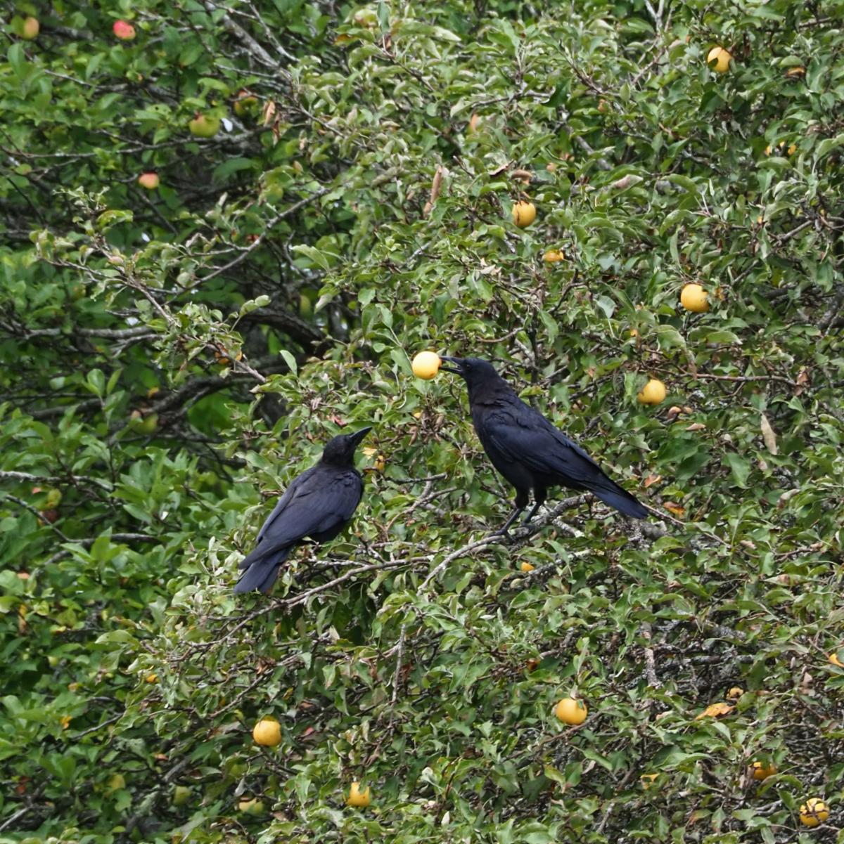 Crows picking apples.