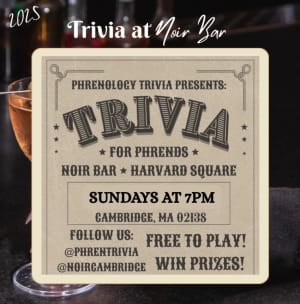 FREE Trivia – Every Sunday at 7:00 PM, join us at Noir Bar for an exciting, quirky night of trivia hosted by Phrenology Trivia.