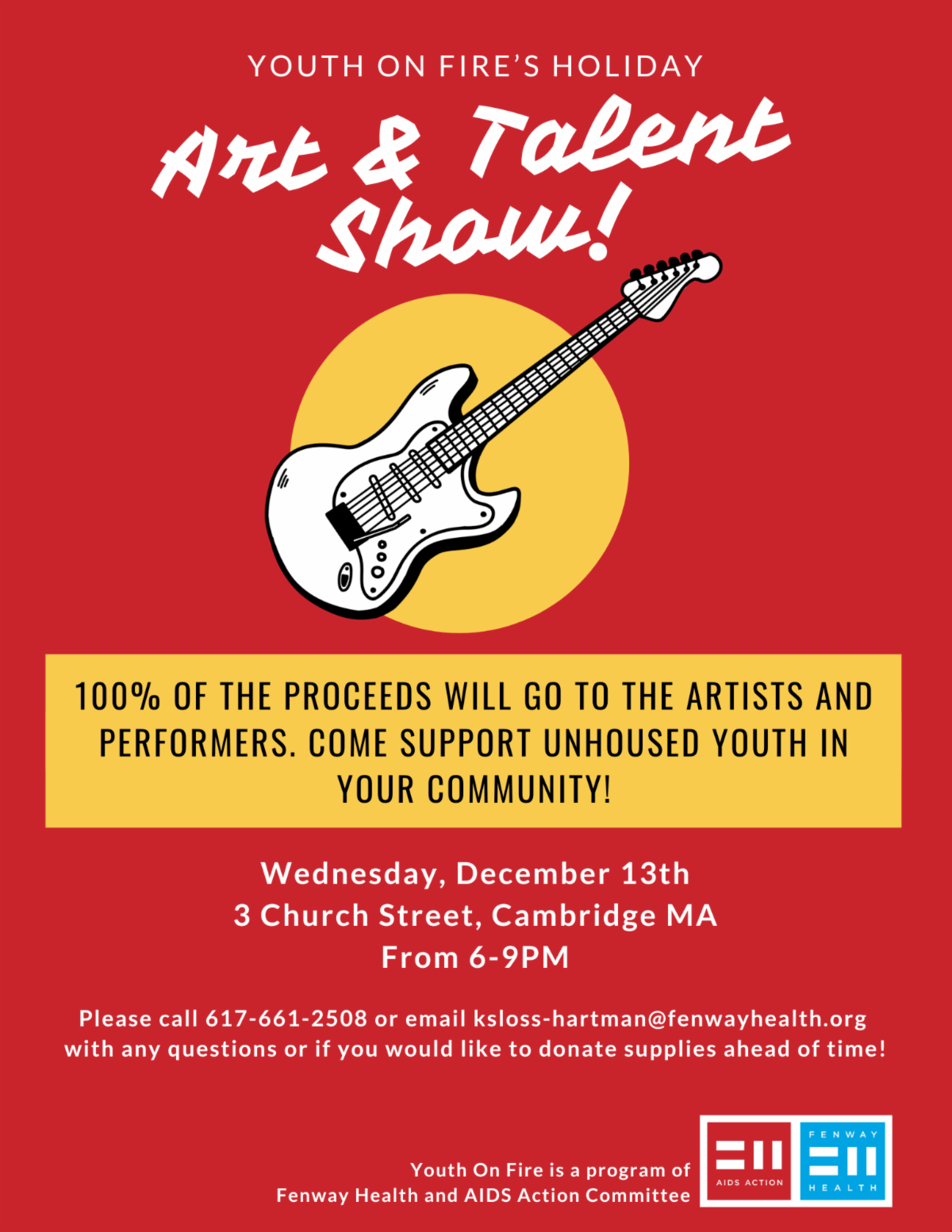 Youth On Fire is hosting a HOLIDAY ART AND TALENT SHOW on Wednesday, December 13th from 6-9pm! Our August show was a wonderful night with lots of incredible art and performances, and we decided to host another right in time for the holidays. Our members, unhoused youth between the ages of 14-24, will be selling art they've made and performing for attendees. All the money they make from sales and performances will go directly to them!
