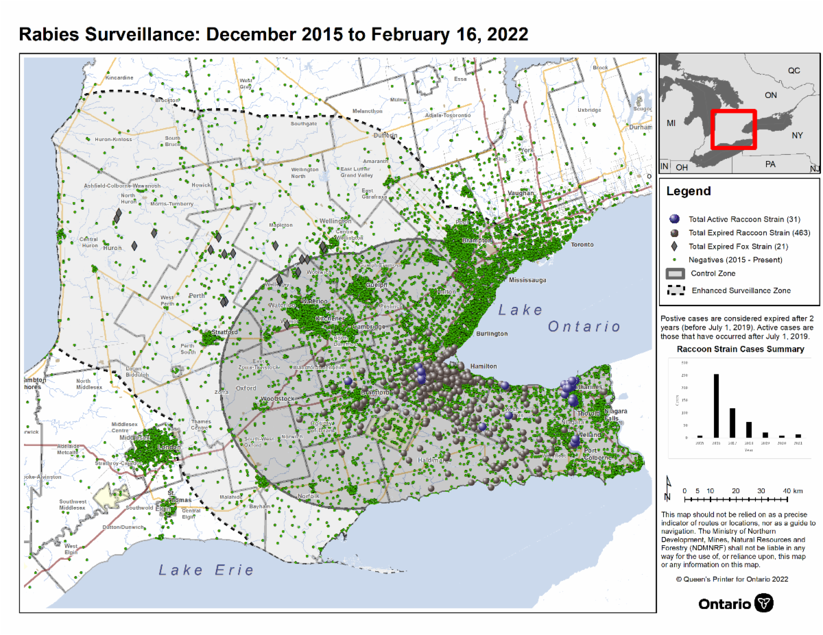 In an effort to provide a clearer indication that these animals have not been reported to have had any human or animal exposure we have updated the Provincial Sample ID Numbering system for these cases. These cases will now include the prefix Year + AHLG, or Year +AHLK (e.g. 2022AHLG-HAM-001-RAC), dependant on whether the specimen was processed through the University of Guelph's Animal Health Laboratory in Guelph or Kemptville, Ontario. When the OAVT RRP receives a positive result from one of these cases we will still continue to email you a copy of the results to ensure you are aware that rabies has been detected in your PHU area.