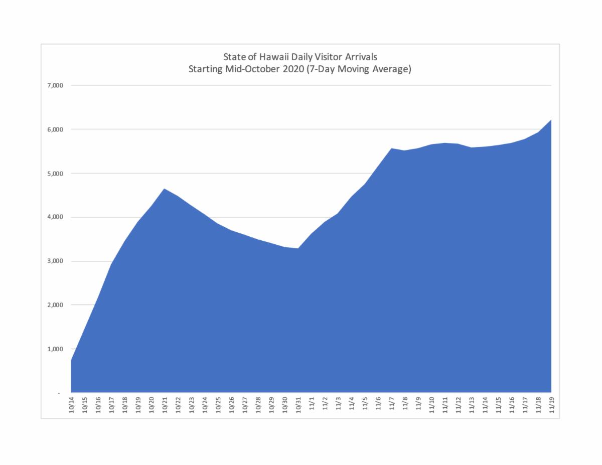 The chart below presents daily statewide visitor arrivals as reported by HTA using a 7-day moving average since the start of the pre-arrival testing program began on October 15. After remaining below 1,000/day, statewide daily visitor arrivals spiked starting on Oct. 15, 2020. This likely reflects both pent-up demand and adjustments of travel dates to take advantage of the pre-departure testing exemption. Arrivals tailed off for about a week and a half to the 3,500/day level toward the end of October before picking up to the 5,500/day level by the end of the first week of November. Daily visitor arrivals plateaued at about 5,600/day for a week before ticking up again after mid-November. By Nov. 19, 2020, the 7-day moving average had crossed the 6,000 mark.
