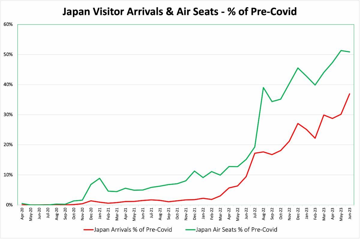 The Japanese visitor market has rebounded from COVID-19 much more slowly than the US market did. By May 2021 statewide US visitor arrivals had equaled their pre-pandemic level. With restrictions on international air travel persisting into 2022, the Japanese market is in the early stages of recovery. In June 2023 statewide Japanese visitor arrivals only equaled 37% of pre-pandemic arrivals.