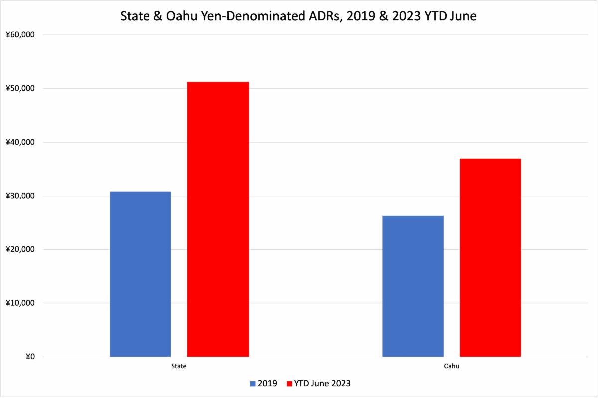 One factor that has been cited in explaining the slow return of the Japanese market is the exchange rate. In 2019 the average exchange rate was 109 yen to the dollar but now is at 147 to the dollar. This year the yen rate has averaged 135, making the dollar 24% more expensive for Japanese travelers. With hotel room rates also increasing during this period, the yen-denominated price of a Hawaii hotel room increased 65.9% compared with 2019. Because of more modest ADR growth on Oahu, the yen price of an Oahu hotel room increased 41% compared to pre-pandemic.