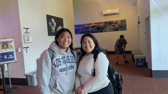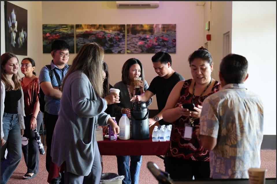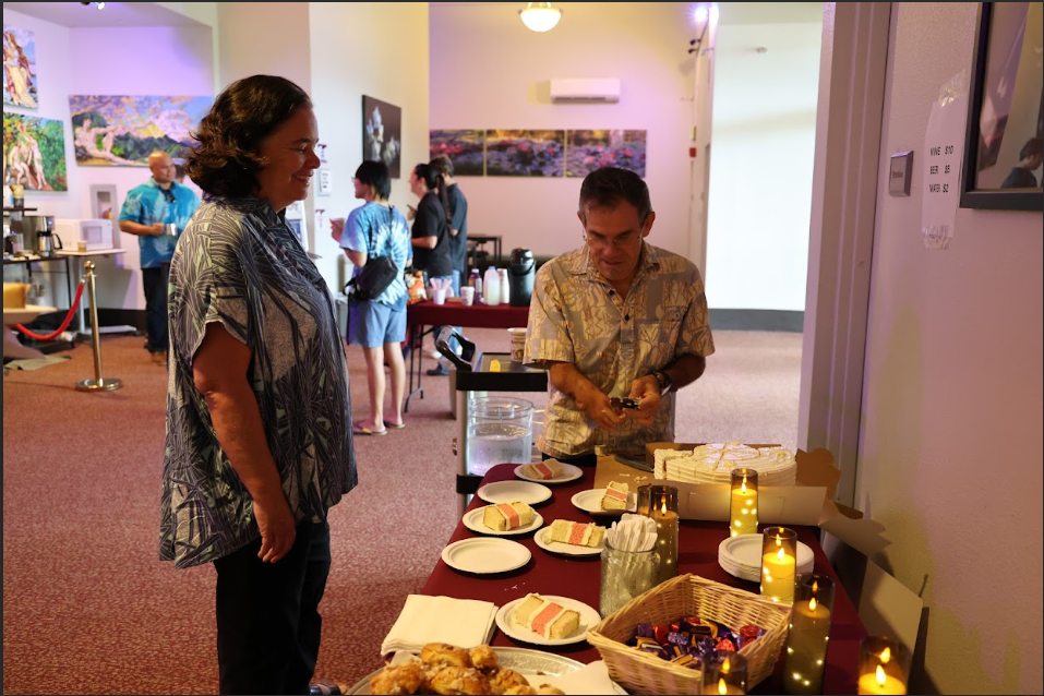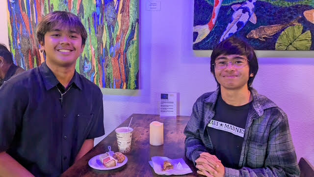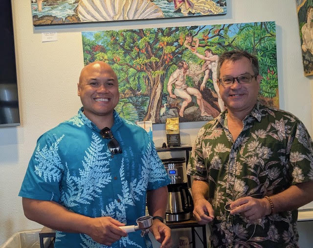 | | | For the first event, 80 people attended...not too shabby. | | No`eau Keopuhiwa (left) was our Guest Barista, and Mark Ombrello helped set up the coffee bar. | | Chancellor Sanchez promoted, hosted & brought a HUGE Cake to the event. Thomas Vidinha helped put the whole thing together. | | Dean Kurt Takamine enjoying the mix of students staff and faculty..the KCC Ohana. | | For a while, the Espresso line got backed up, prob because No`eau is so talented with the process. | | BJ, President of the KCC Student Body with friend & fellow bandmate from the KCC Orchestra. | | Coming Soon to a PAC Near You! | | |