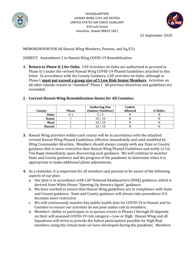 All members and cadet parents are highly encouraged to review the following documents related to Hawaii Wing's plans for remobilization. These documents address our return to various CAP activities. Click on the images below to read the documents, or check out our HIWG News page.