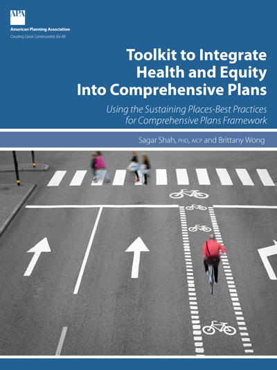 [Image description: A report cover for "Toolkit to Integrate Health and Equity Into Comprehensive Plans: Using the Sustaining Places-Best Practices for Comprehensive Plans Framework" by Sagar Shah, PhD, AICP, and Brittany Wong. Published by the American Planning Association.]