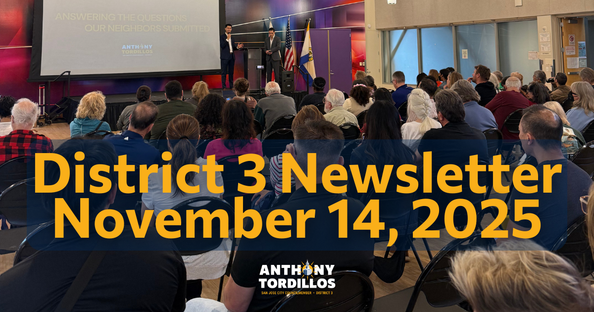 Next week will mark my first 100 days in office. In that time, I’ve attended dozens of community meetings, built a District 3 office to serve our residents, and passed legislation to make San José safer, cleaner, and more affordable. Check out the recording of our Town Hall and our microsite with the links we shared to get caught up on what we’ve gotten done so far.