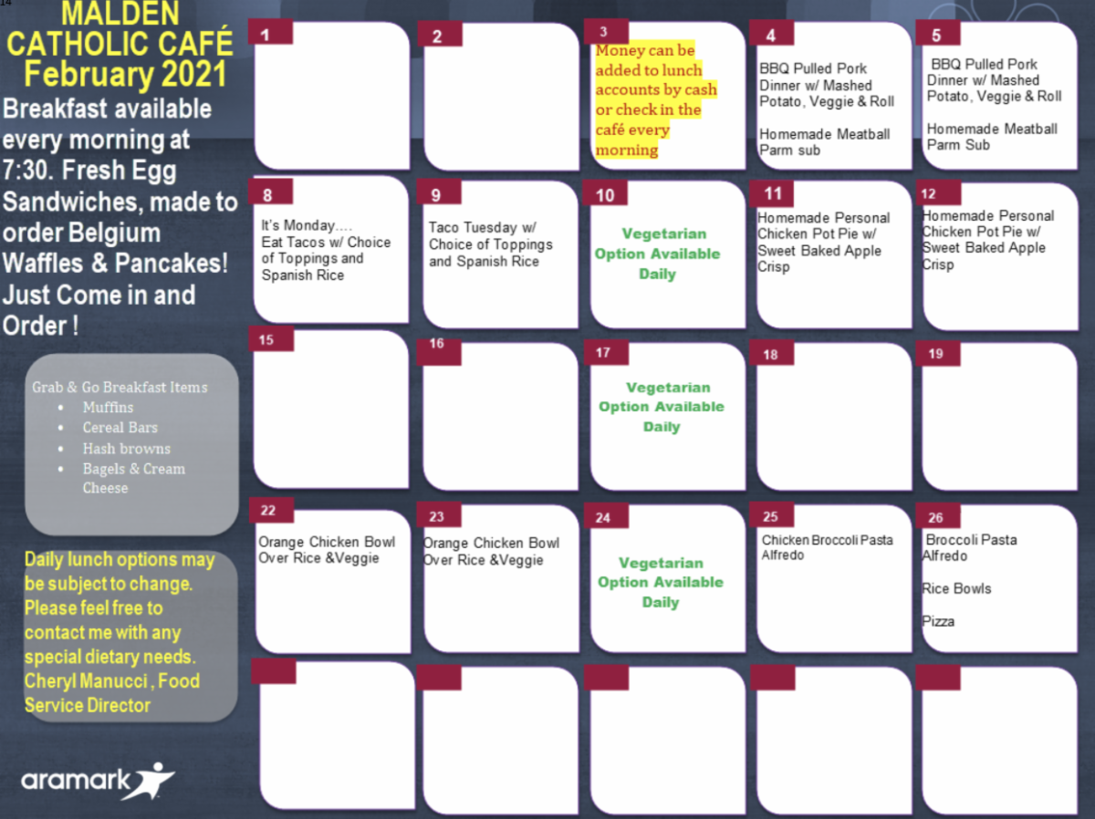 MC Cafe's February menu is now available. You can also find the menu on the Malden Catholic website by clicking here.