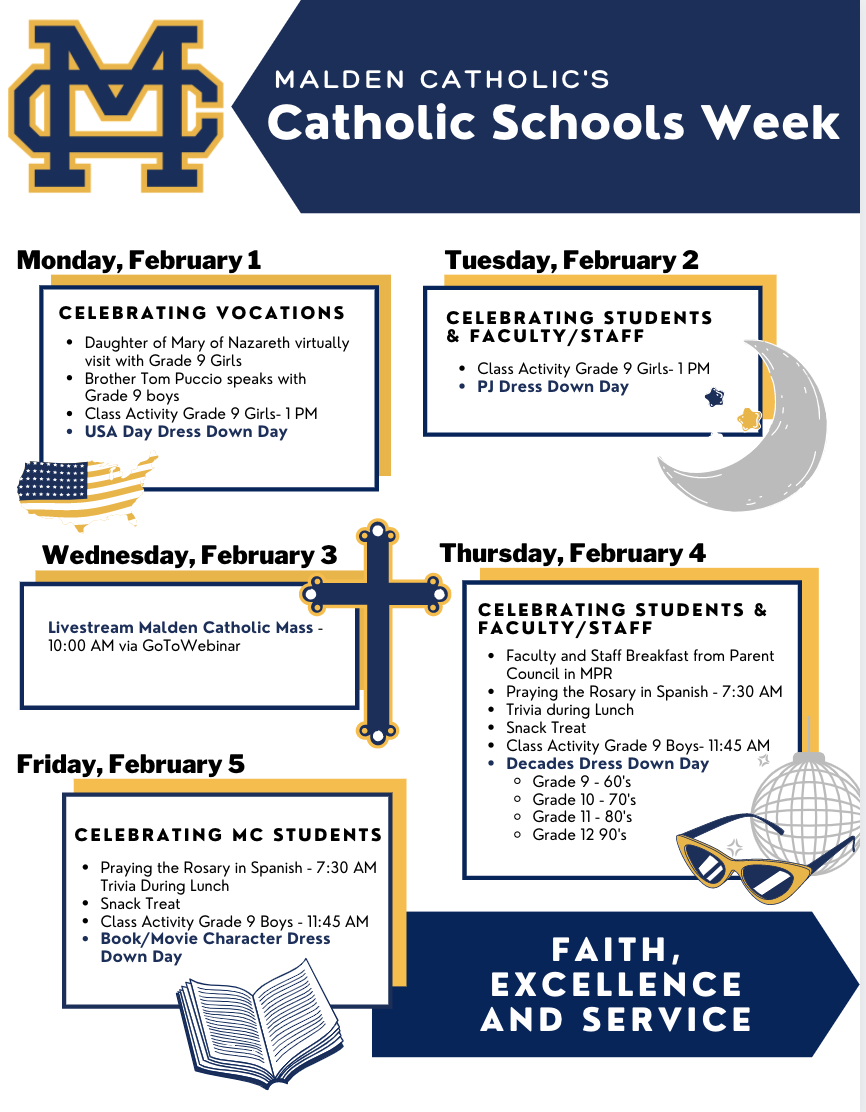 The Catholic Schools Week 2021- 2024 theme is “Catholic Schools: Faith. Excellence. Service.” As members of the Malden Catholic community, may we all strive to live in active service of Jesus and his mission as we nationally join together to celebrate this week!