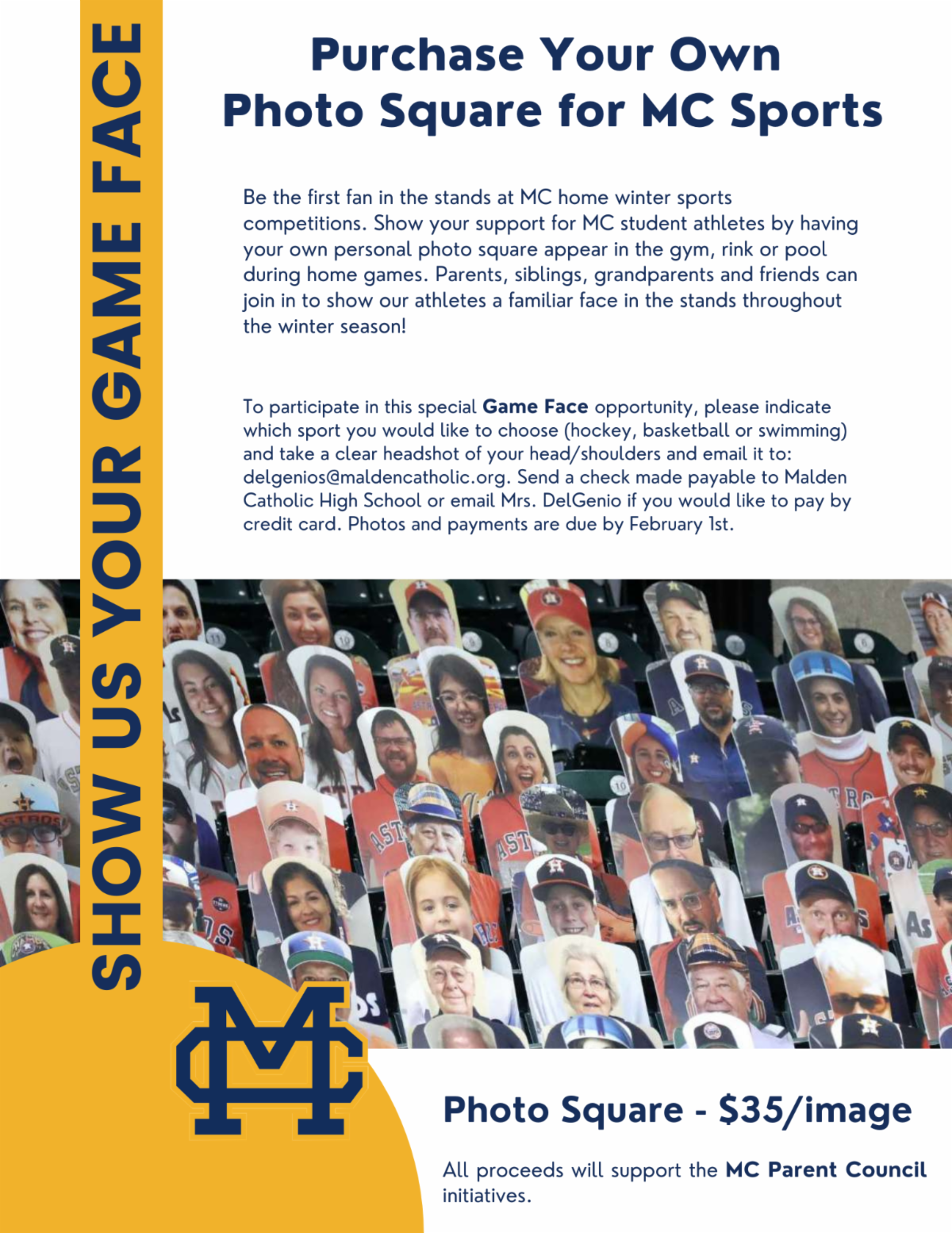 To participate in this special Game Face opportunity, please indicate which sport you would like to choose (hockey, basketball or swimming), take a clear headshot of your head/shoulders, and email it to: delgenios@maldencatholic.org. Send a check payable to Malden Catholic High School or email Mrs. DelGenio if you would like to pay by credit card. Photo squares are $35/image. Photo submission and payments are due by February 1. Proceeds will support MCPC fundraising for future students, faculty and staff events and performances.