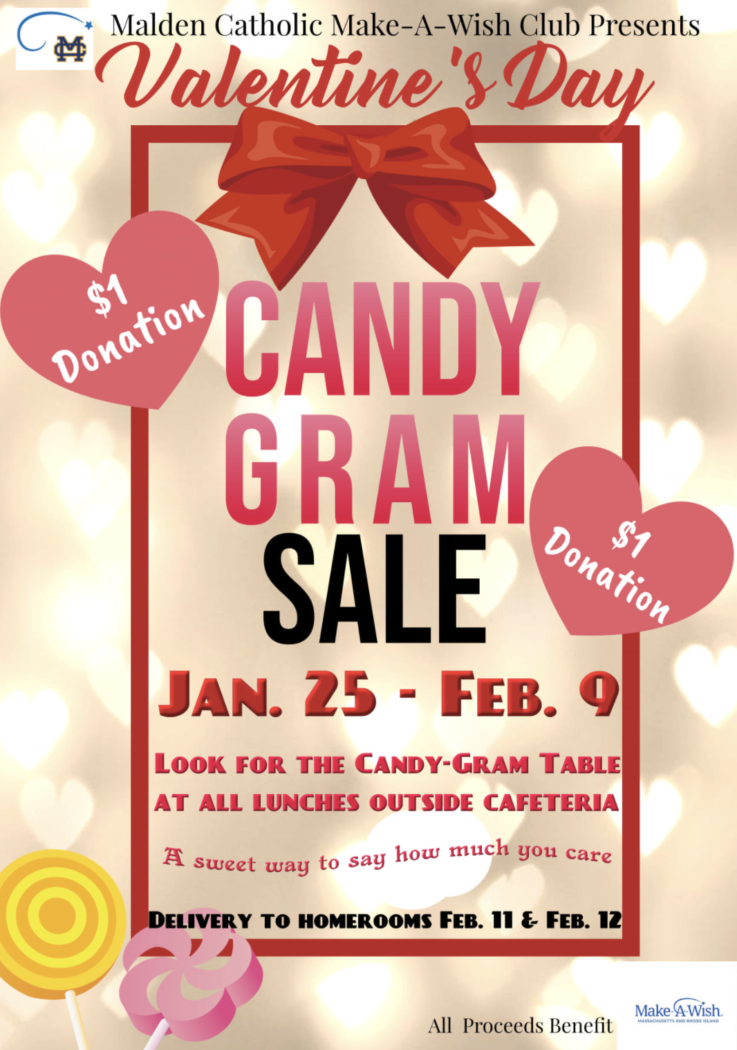 If you have not already purchased your Candy Gram, here is a sweet way to say how much you care for your friends and teachers on Valentine's Day! Candy grams are available during lunch for $1 during lunch periods until Tuesday, February 9th and will be delivered to homerooms on Thursday, February 11 for the Blue Cohort and on Friday, February 12 for the Gold Cohort. Let someone know you are thinking of them and help a great cause!
