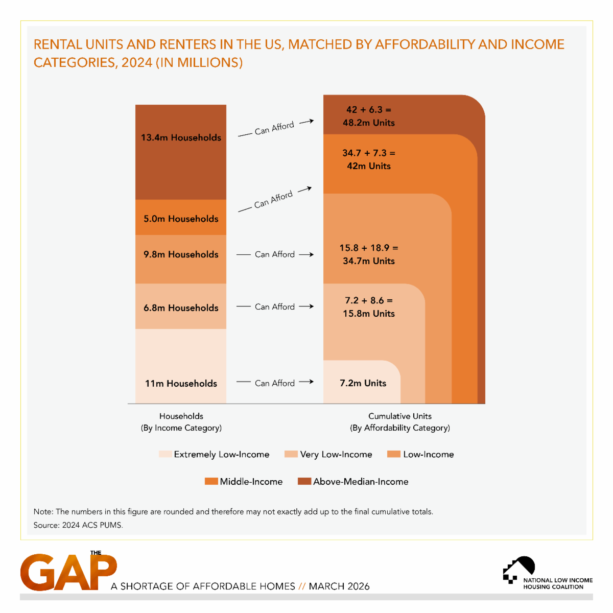 A new report from the National Low Income Housing Coalition, The Gap: A Shortage of Affordable Homes, offers a stark reminder of just how deep the housing crisis runs, and why local action in New York City is so urgent. The report examines the availability of housing for extremely low-income (ELI) renters, defined as households earning at or below 30% of Area Median Income or the federal poverty level (whichever is greater), with a national average of about $26,111 for a two-person household. What they find is clear: the housing market is fundamentally not built to serve those with the lowest incomes.