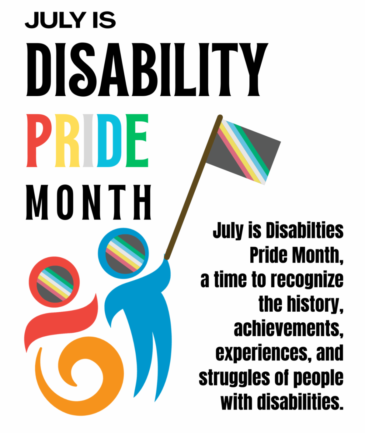 Disability Pride Month is celebrated every July to commemorate the signing of the Americans with Disabilities Act (ADA) on July 26, 1990. This month is intended to promote inclusion of people with disabilities and to ensure they are accepted exactly as they are and acknowledge they are a vital part of every community. The original Disability Pride flag was created by Ann Magill, who has cerebral palsy. It was developed to raise awareness and as a symbol of solidarity, acceptance and pride. In 2021 Magill collaborated with others to update the flag to be more accessible. Each color stripe represents a different group within the disability community: