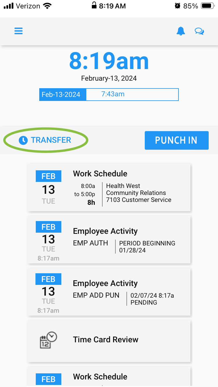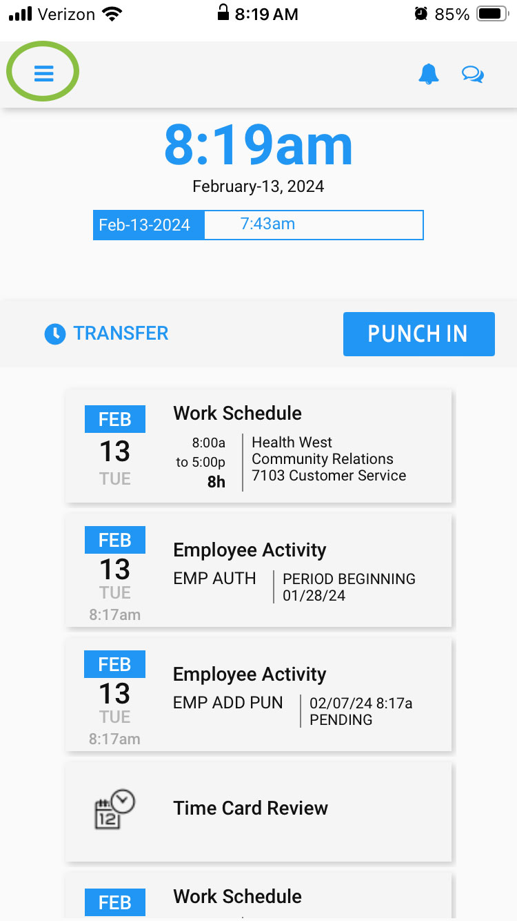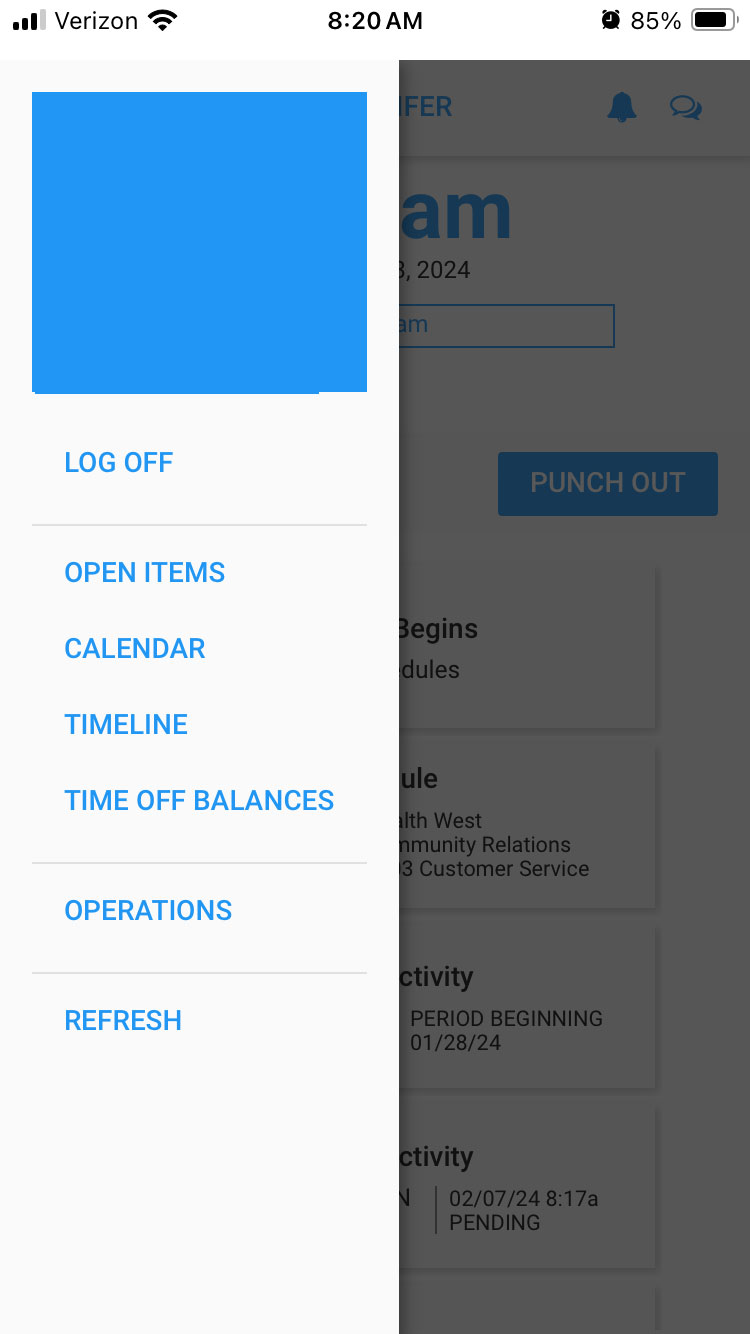 On the home screen, you can access an additional menu by tapping the "Hamburger Menu" at the top (the three horizontal lines). After doing so, a menu will slide out where you can check any open items (such as missed punches), a calendar showing what you have worked, and your time off balances.