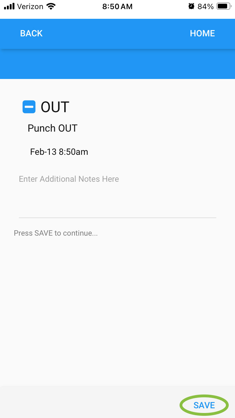 Every time you open your ESS Mobile App the app's home screen (shown in the image below on the left) shows up. If you are just starting work for the day, it will give you the option to PUNCH IN. If have already punched in for the day, it'll give you the option to PUNCH OUT. After you PUNCH IN or PUNCH OUT, the second image below shows up. At this point, you can add any important notes that your supervisor should know (such as why you were late for your shift, why you worked late or any other important info) and then tap SAVE at the bottom of the screen.