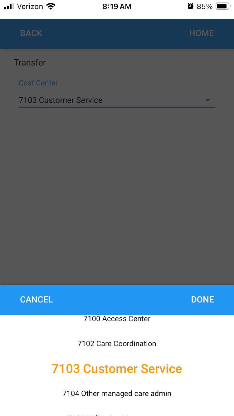On the home screen of the app is a button for TRANSFER. When you tap the button, it will take you to the Transfer screen. To select the appropriate cost center, click the down arrow and it will allow you to select the appropriate cost center (shown on the right here). All you need to do is scroll through the options, select the one that applies to you and then tap DONE.