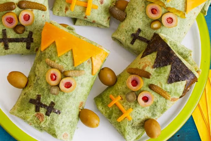 You'll need spinach wraps, a sandwich filling of your choice, sliced cheese, nori, a selection of olives, cornichon pickles, celery, carrots and grapes to decorate and maybe some cream cheese for glue. Kids love creating their own monsters. It's a great activity for a class party and makes a great balanced snack to even out the blood sugar before the kids go out to get all that candy.