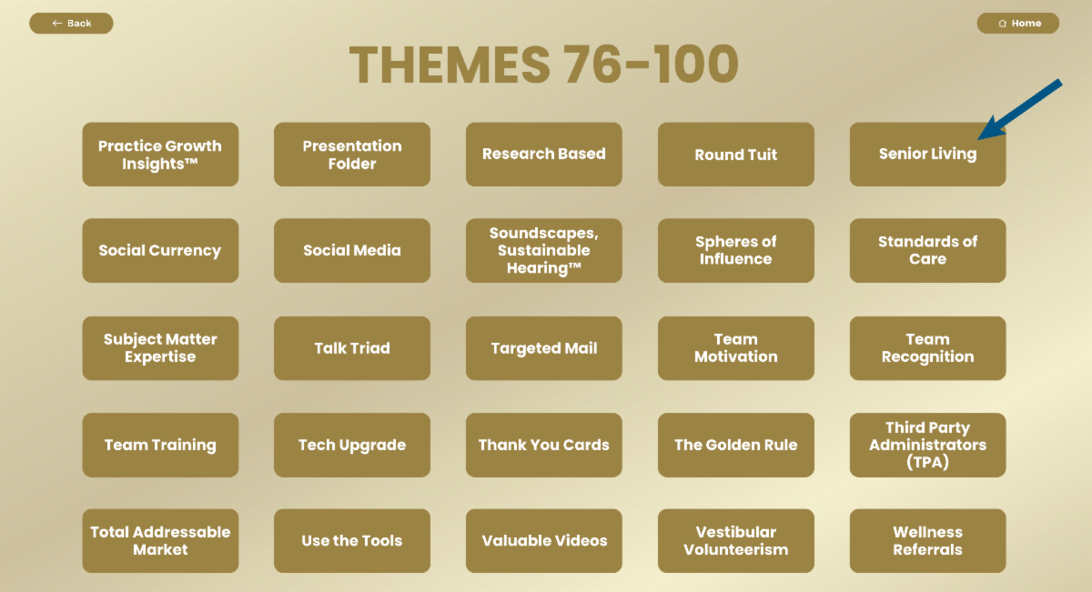 | | When searching 100 Strategic Themes for Senior Living, | | After years of program and content development inspired by leading Practices, 36 curated volumes are in full view: | | |