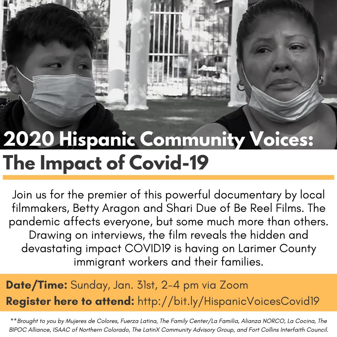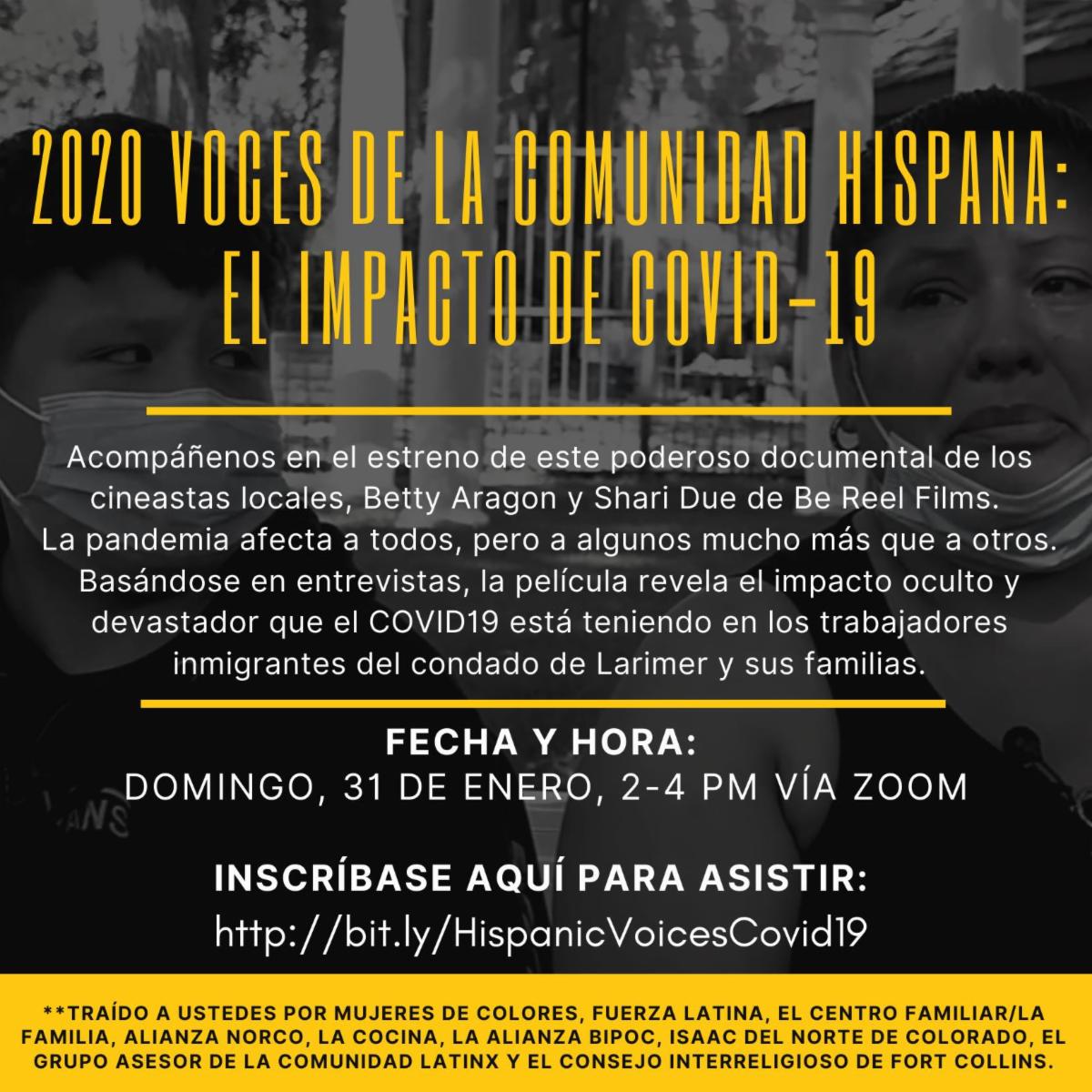 "Join us via Zoom for the for the premier of this powerful documentary film by producer Betty Aragon and director Shari Due of Be Reel Films. We are all impacted by the pandemic, but some of us have more resources and privileges to navigate the crisis. Drawing on dozens of interviews, this film reveals the hidden impact the COVID19 crisis is having on Larimer County Latinx/immigrant workers and their families – essential workers whose industries are hard hit economically, who do not have the privilege to work remotely, and who are left out of many critical forms of assistance. The online film screening will be followed by a panel and Q&A with Betty Aragon, film participants and community leaders."