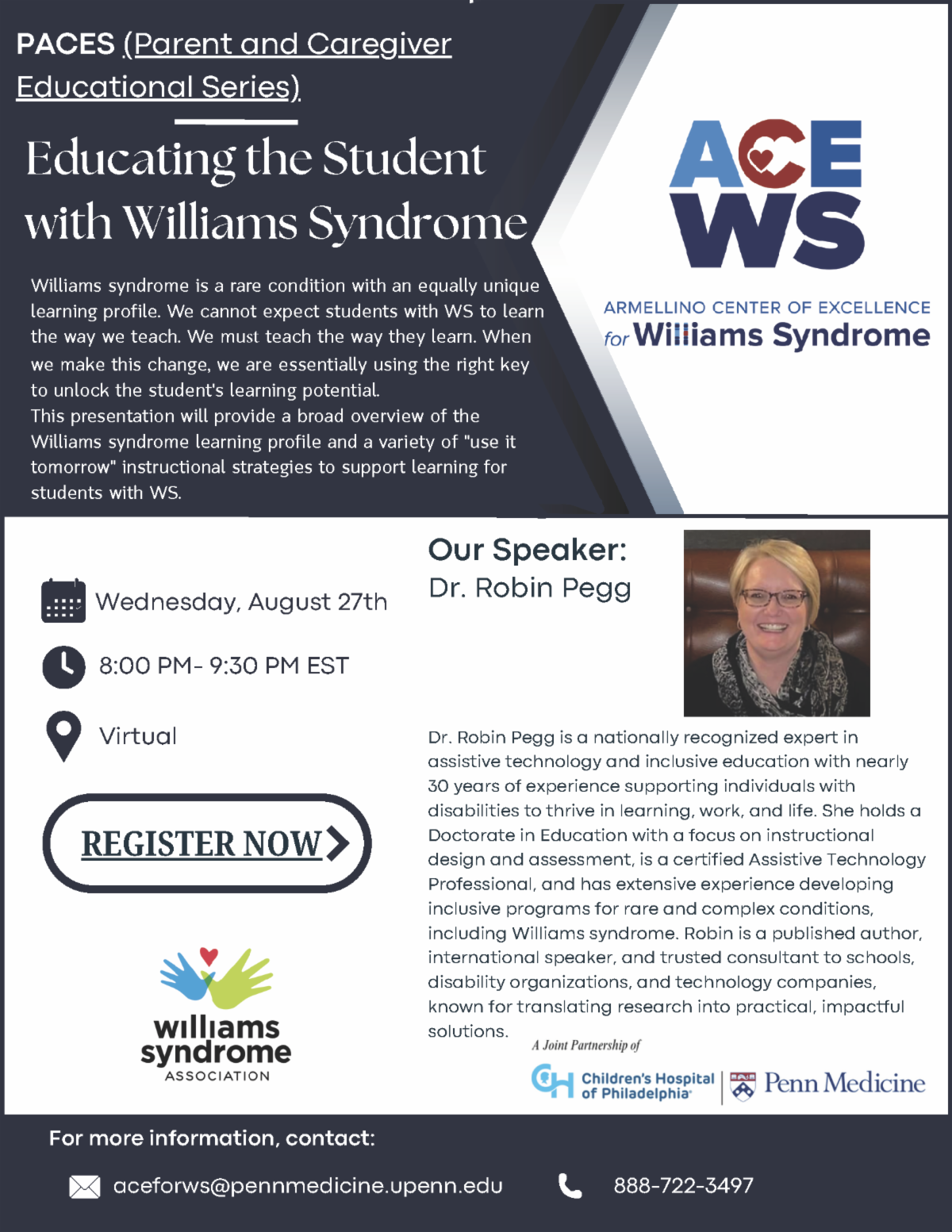 You are invited to Dr. Robin Peggs's presentation on "Educating the Student with Williams Syndrome." This presentation will provide a broad overview of the Williams syndrome learning profile and a variety of "use it tomorrow" instructional strategies to support learning for students with WS.
