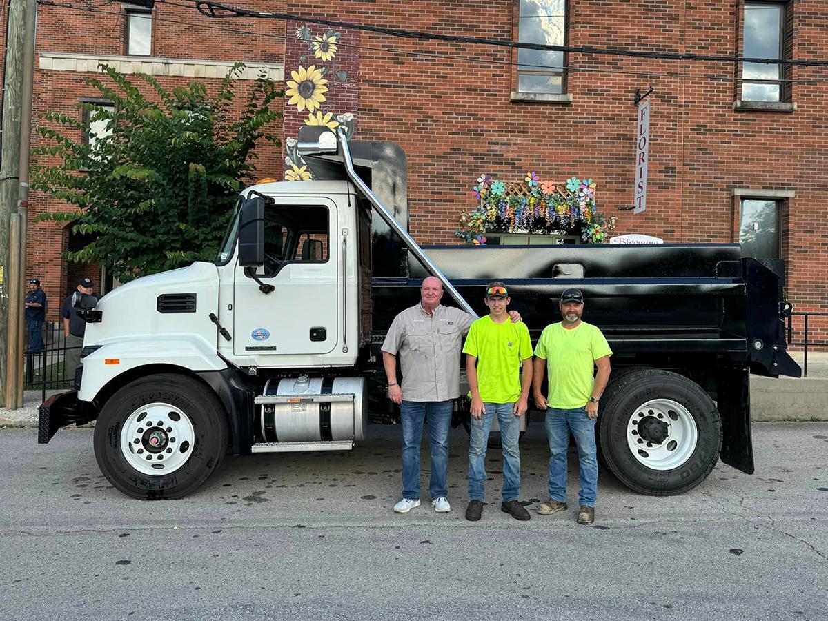 Judge/Executive Steve Mays and Lee County Fiscal Court celebrated this 2024 Mack MD Single Action Dump truck acquisition. The truck will be more accessible to narrow roads in Lee County. This purchase was made possible by the EK-SAFE Grant funds. Pictured with Mays are County Road Foreman Kevin McIntosh and his son, Kolby McIntosh. | |