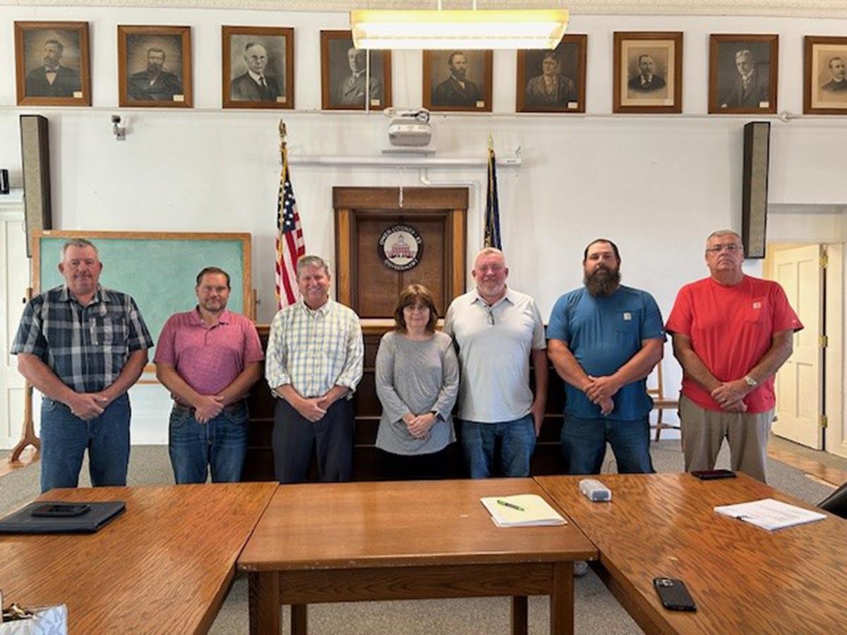 KACo's Lonnie Campbell and BJ White also made a recent visit to an Owen County fiscal court meeting. From left are: magistrates Wayne Harris and Travis Fitzgerald, Campbell, White, Judge/Executive Todd Woodyard, and magistrates Dane Perkins and Tom Slayback. | |