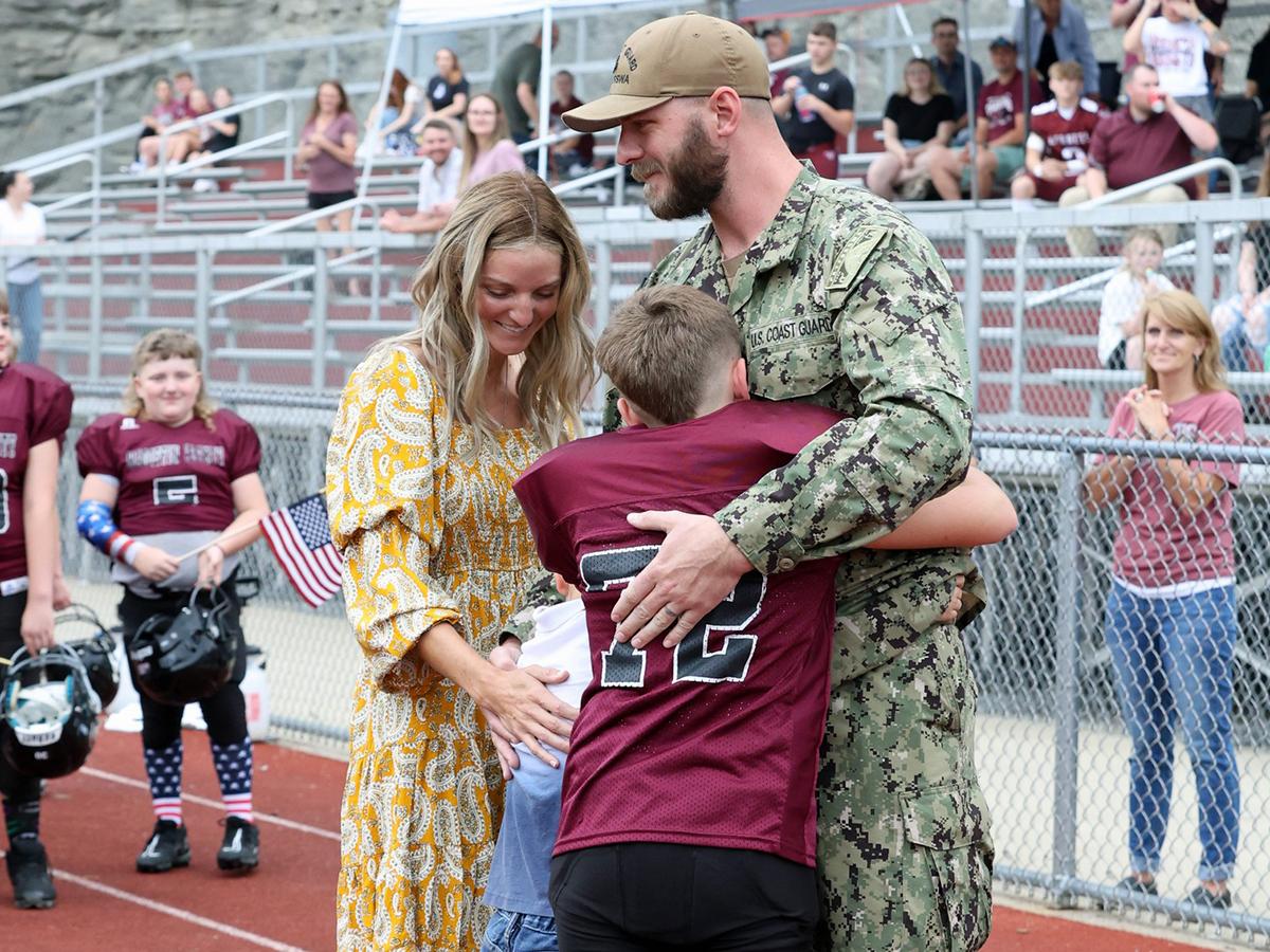 After more than a year of deployment, Petty Officer James Daniel Smith surprised his sons, Raylan and Rhett, prior to the start of a football game in Magoffin County. | |