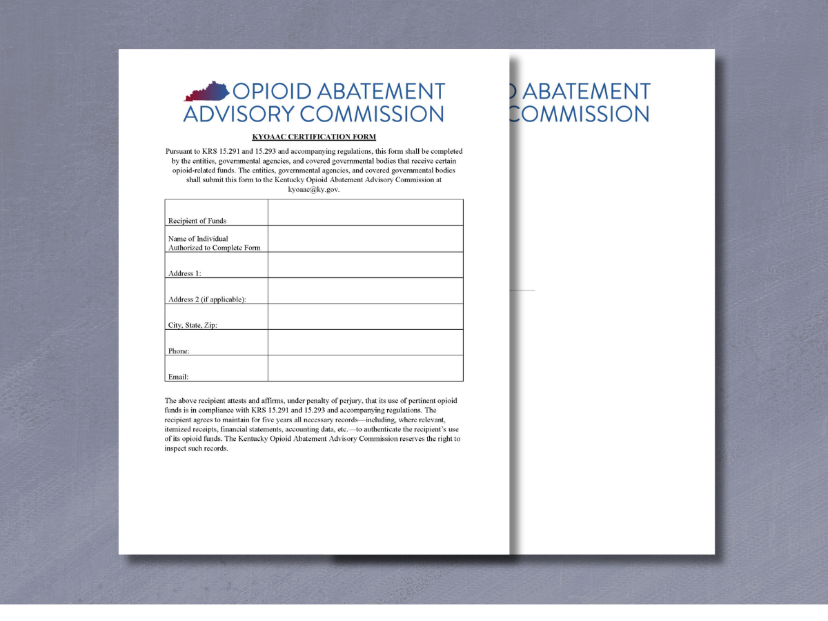 Local governments are required to submit a quarterly certification form to the Kentucky Opioid Abatement Advisory Commission. This form, available on the Commission’s website, must be completed and submitted by an authorized official.