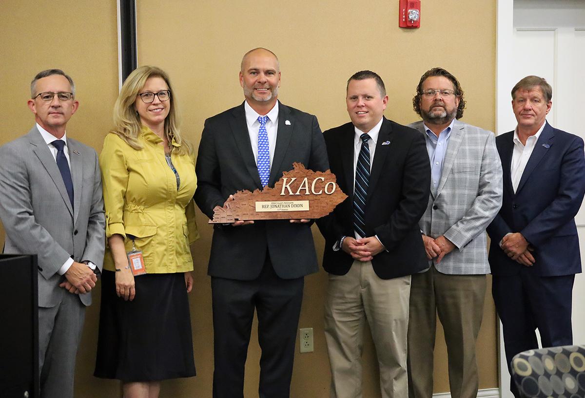 At Thursday's KACo Board of Director's meeting, Rep. Jonathan Dixon was recognized as a County Advocate for his efforts as co-chair of the annexation task force, which led to significant compromise legislation. From left are KACo Executive Director Jim Henderson, Government Affairs Director Shellie Hampton, Rep. Dixon, President-Elect Dan Mosley, 1st Vice President Adam O'Nan and 2nd Vice President Michael Logsdon. | |