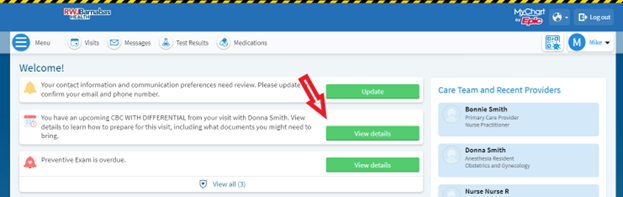 Once MyChart is active, the patient can find upcoming labs either on the home screen or under Upcoming tests and Procedures in the Menu.