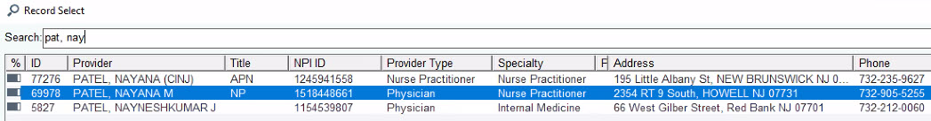 Click the magnifying glass in the Provider field to see additional details about providers with the same name to find differentiating details such as middle initial, specialty, and clinic address/phone number.