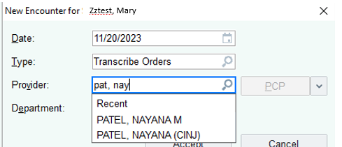 - When creating the transcribed orders encounter, enter part of the provider's last and first names.