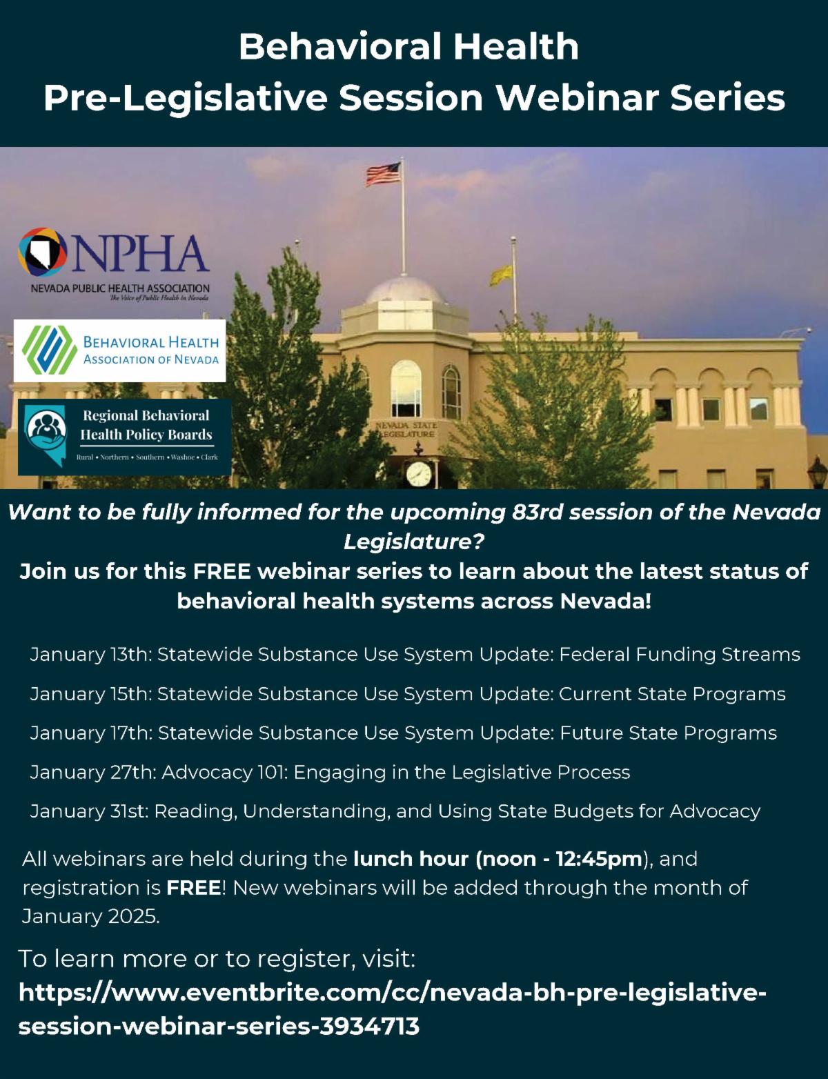 Are you preparing for the upcoming legislative session, or even just want to learn more about the current status of Nevada’s behavioral health systems? If so, join this FREE webinar series available throughout January 2025!