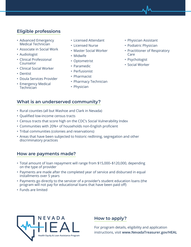 The Nevada HEAL Program will reward healthcare providers who choose to practice in Nevada, by providing up to $120,000 in student loan repayment in exchange for committing to serve in an underserved community.