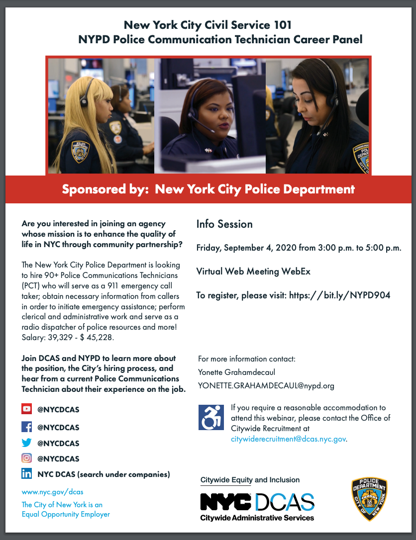New! NYPD Police Communication Technician Career Spotlight CS 101 Information Session | Friday September 4, 2020, 3:00 - 5:00 PM | Register