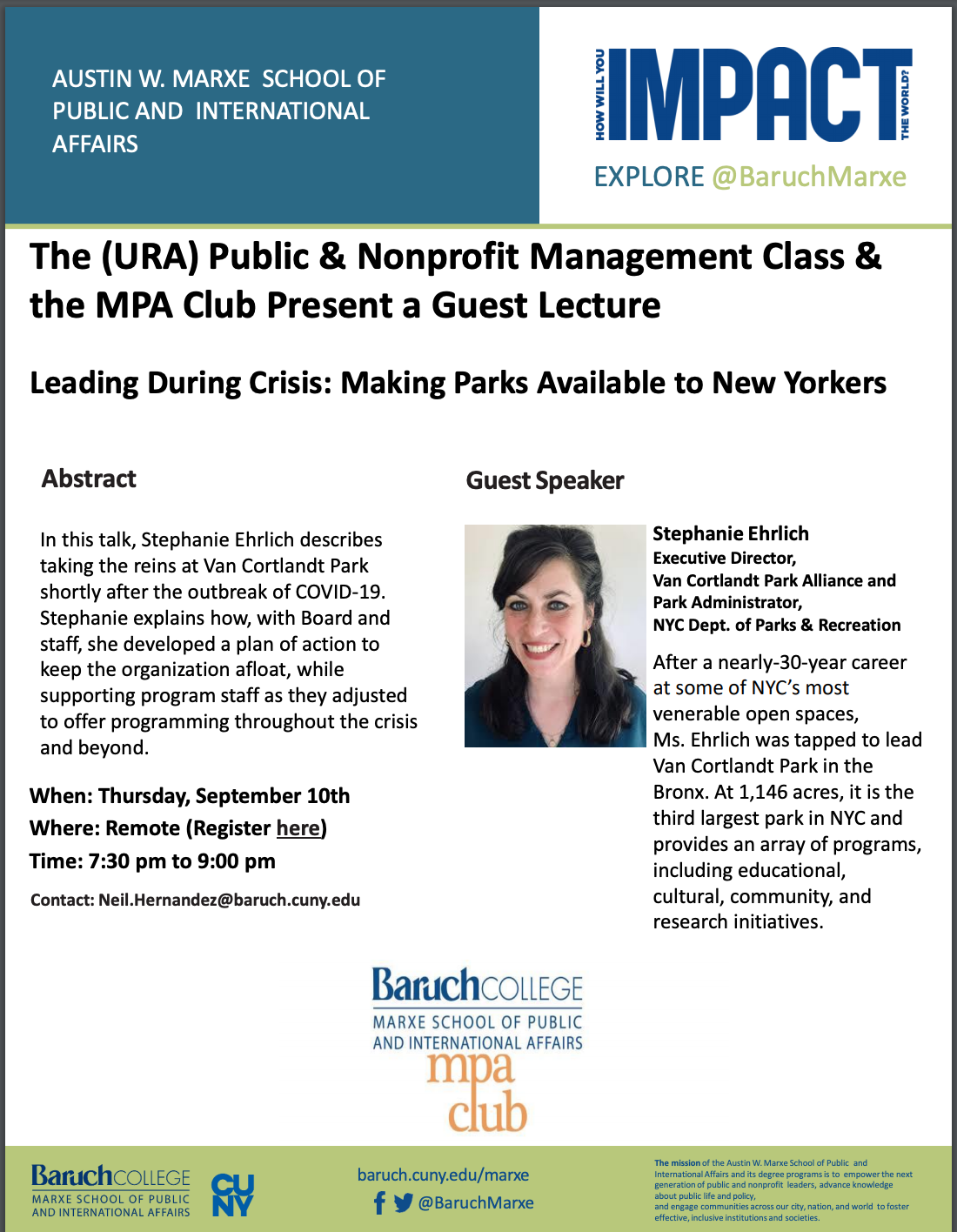 New! The (URA) Public & Nonprofit Management Class & the MPA Club Present a Guest Lecture Leading During Crisis: Making Parks Available to New Yorkers | Thursday, September 10th, 7:30 - 9:00 PM EST