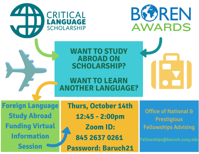 At this information session, we will explain the different scholarship opportunities for foreign language learning, discuss the application process, talk about preparing a competitive study abroad scholarship application, and give you tips on how to plan ahead—academically, financially and personally. Zoom Meeting ID: 845 2637 0261 Password: Baruch21