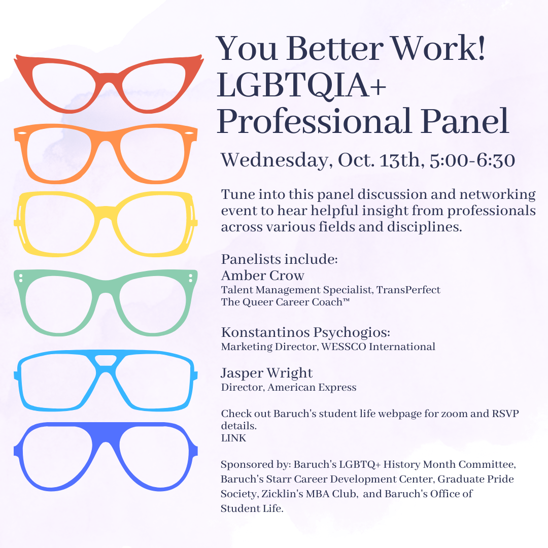 New! You Better Work! LGBTQIA+ Professional Panel | Hosted by LGBTQIA+ History Month Committee | Wednesday, October 13, 5:00pm ET