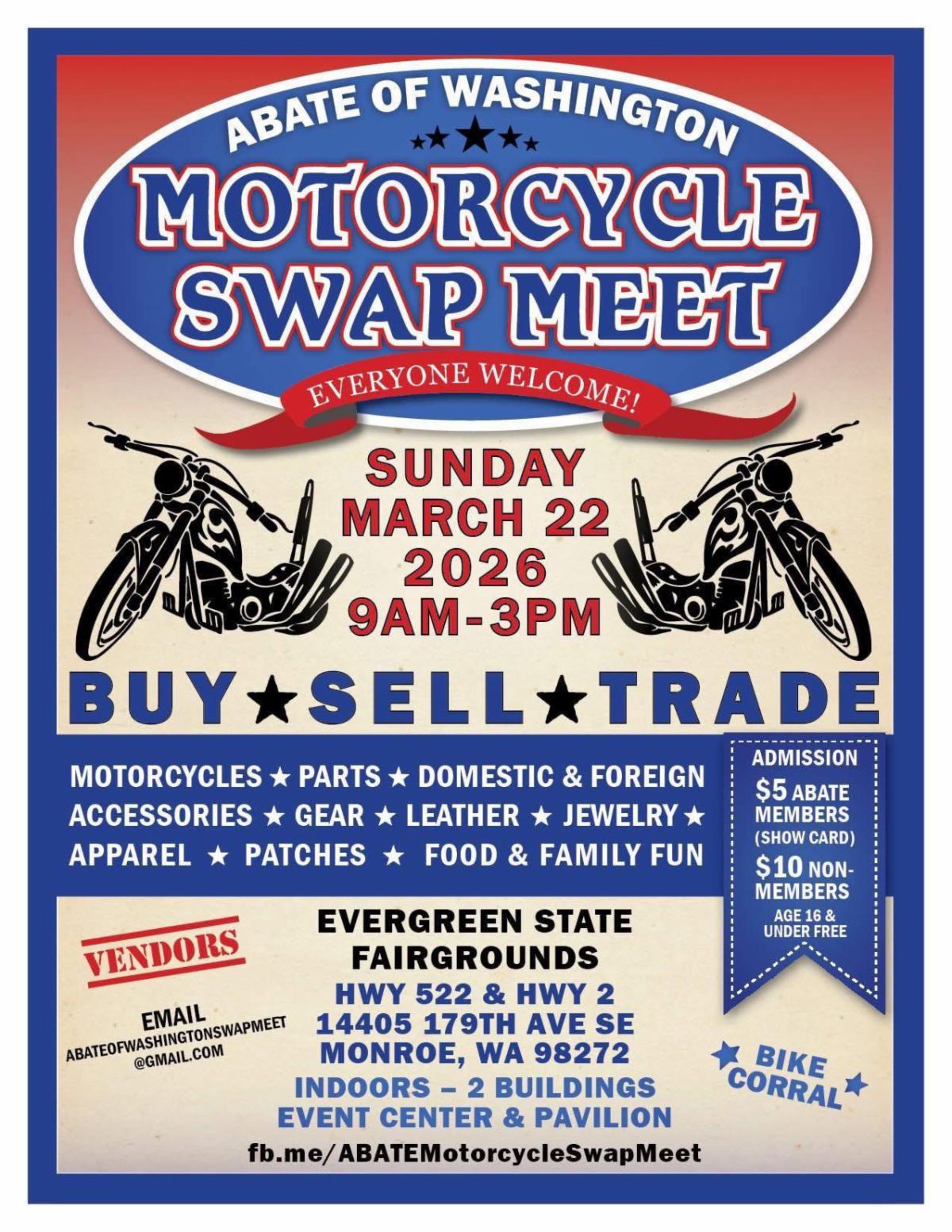 March 22, 2026 9am-3pm ABATE of Washington SWAP MEET in Monore, WA https://www.abate-wa.org/swap-meet (see flyer)