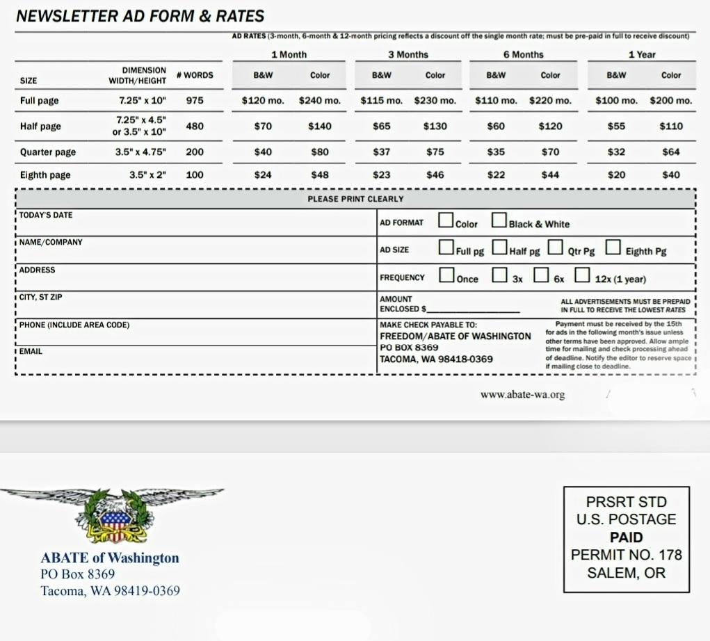 You will be receiving a letter from American Income Life Insurance Company (AIL). As a member of ABATE of WA you qualify to receive a $4,000 Accidental Death & Dismemberment Insurance benefit at no cost to you or ABATE of WA. We have partnered with AIL for several years to offer these benefits.