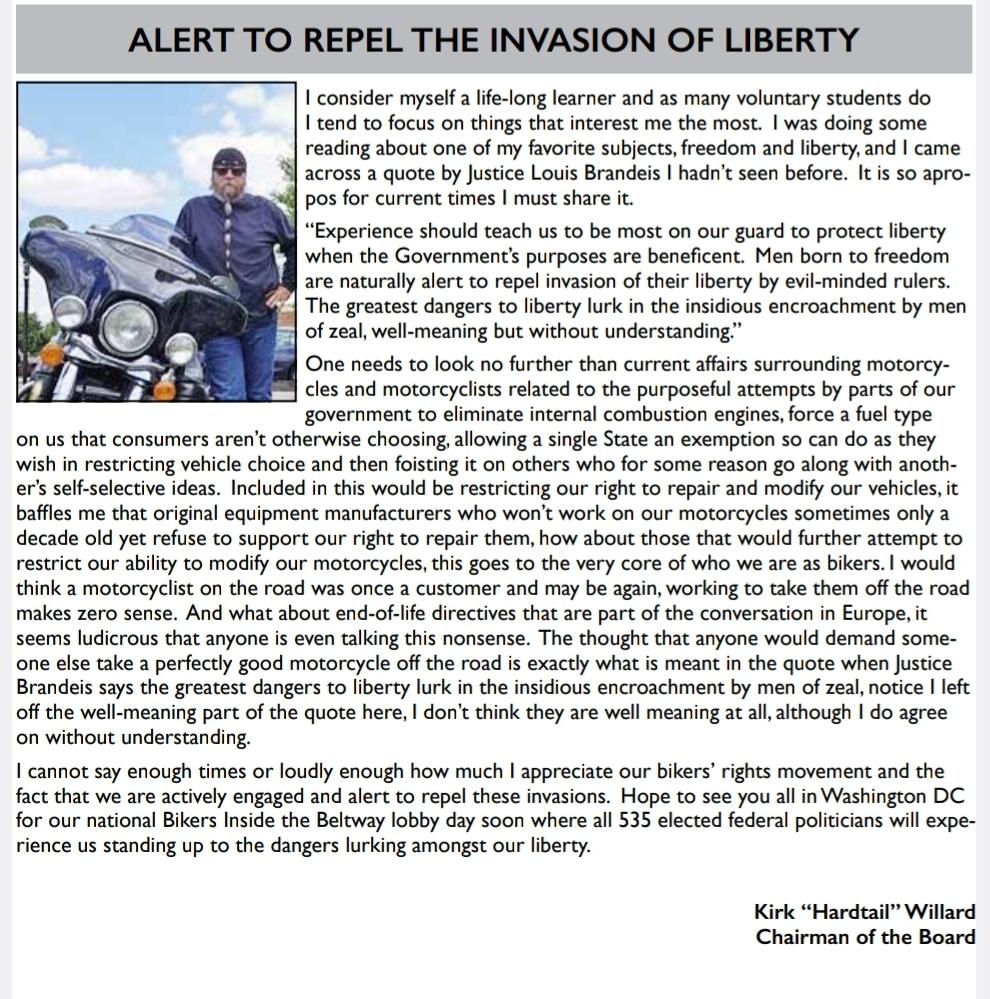 Advocates for fair legislation, freedom of choice, and rider education while supporting local communities.