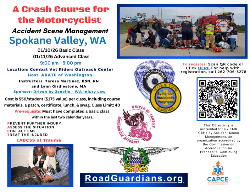 Key Peninsula Chapter had the opportunity to send two members to the Road Guardians Accident Scene Management course, sponsored by Emerald City Harley. They earned certification in Emergency Scene Management. What an incredible and educational experience it was! Not only did we walk away with vital knowledge, but it also made us realize just how unprepared many of our past rides have been! We strongly encourage EVERY rider to consider attending this course or at the very least, familiarize yourself with the material.