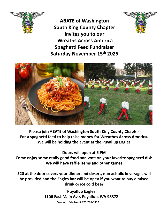 newsletter.abateofwashington@gmail.com This publication is the Official Newsletter of ABATE of Washington. Opinions expressed here in, by the Editor and others, may not be those of ABATE of Washington. Articles may be reprinted with proper attribution.