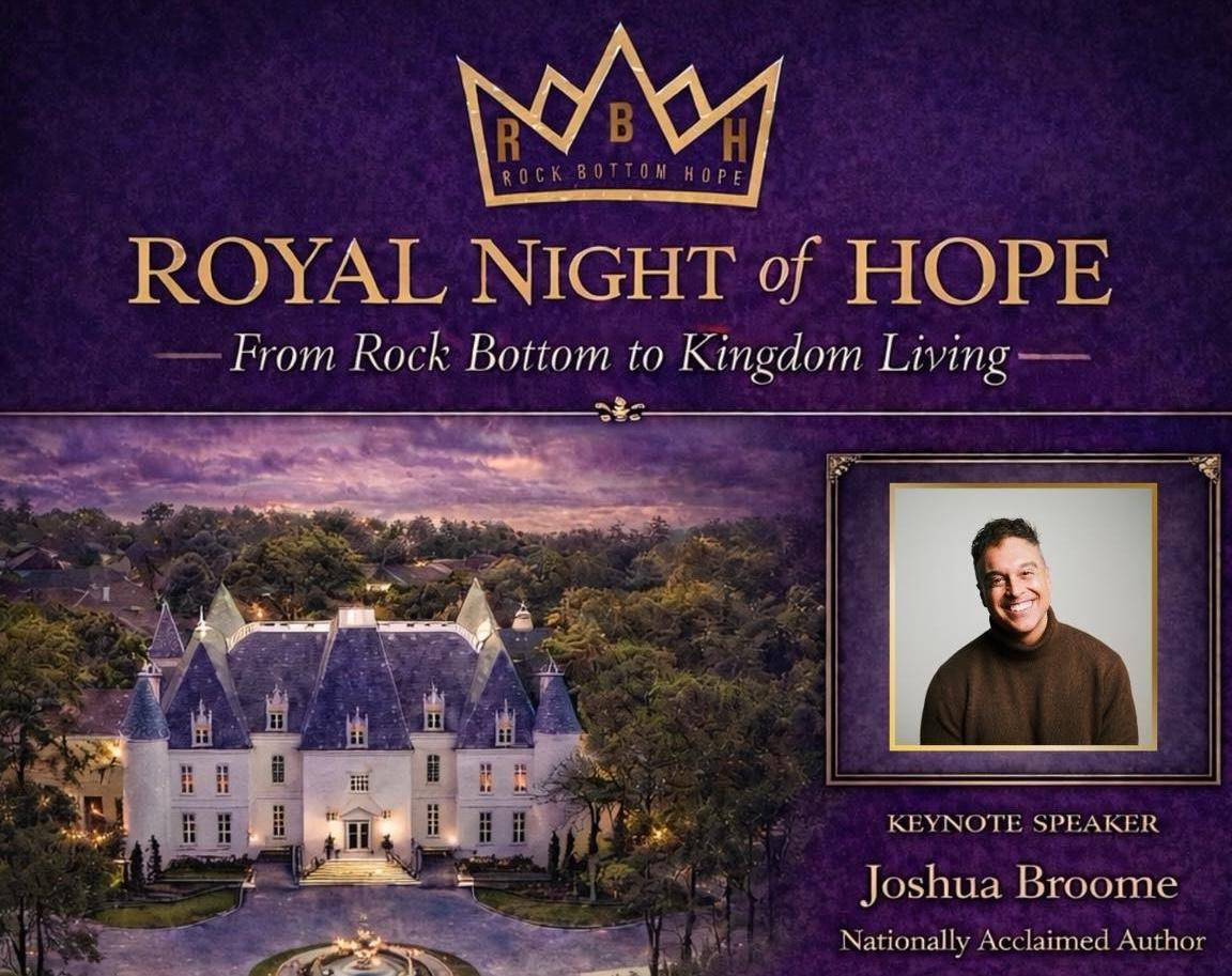 Join us for “Royal Night of Hope – From Rock Bottom to Kingdom Living” on Thursday, March 26 featuring keynote speaker Joshua Broome – a powerful voice of redemption and radical transformation. The Royal Night of Hope is more than a gala – it’s a movement to bring light into the darkest places. Every table, every sponsorship, and every story told helps men and women rise from rock bottom to kingdom living. Together, we’re restoring lives, rebuilding families, and revealing that there is hope – even at rock bottom.