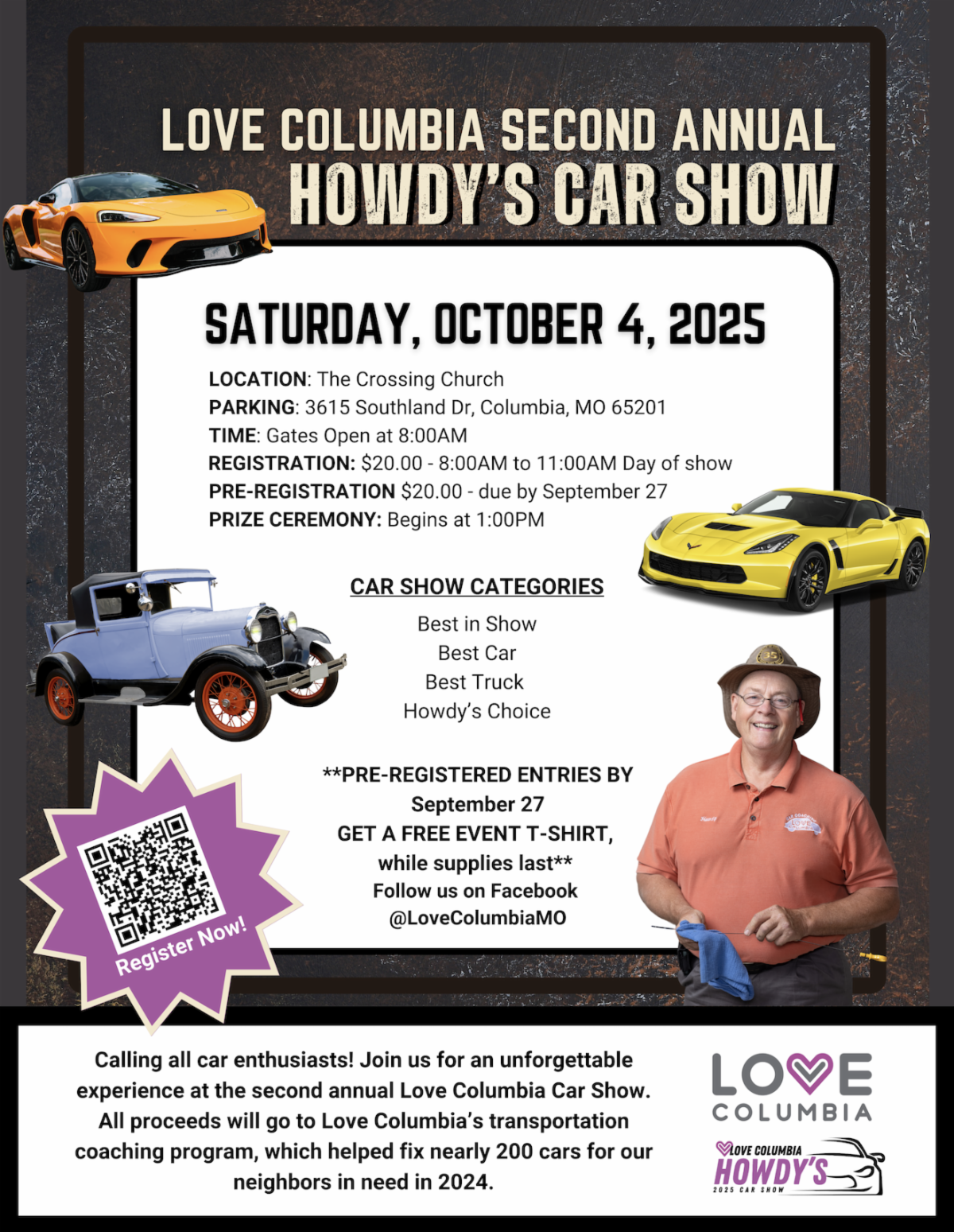 Get ready, car enthusiasts! Join us for the Love Columbia Second Annual Howdy's Car Show on Saturday, October 4, this event is free to attend and open to the public. If you would like to enter your vehicle into the show, the registration fee is $20.