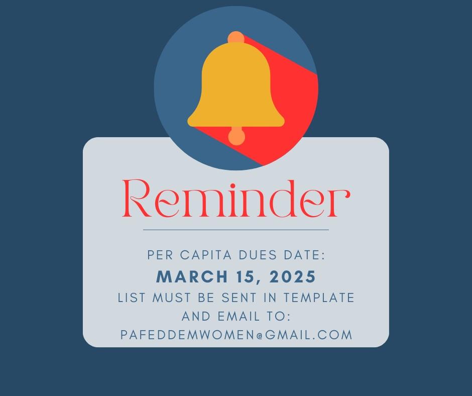 All club dues of $5.00 per member are due by March 15, 2025. Please ensure that checks are made payable to PFDW and mailed to: