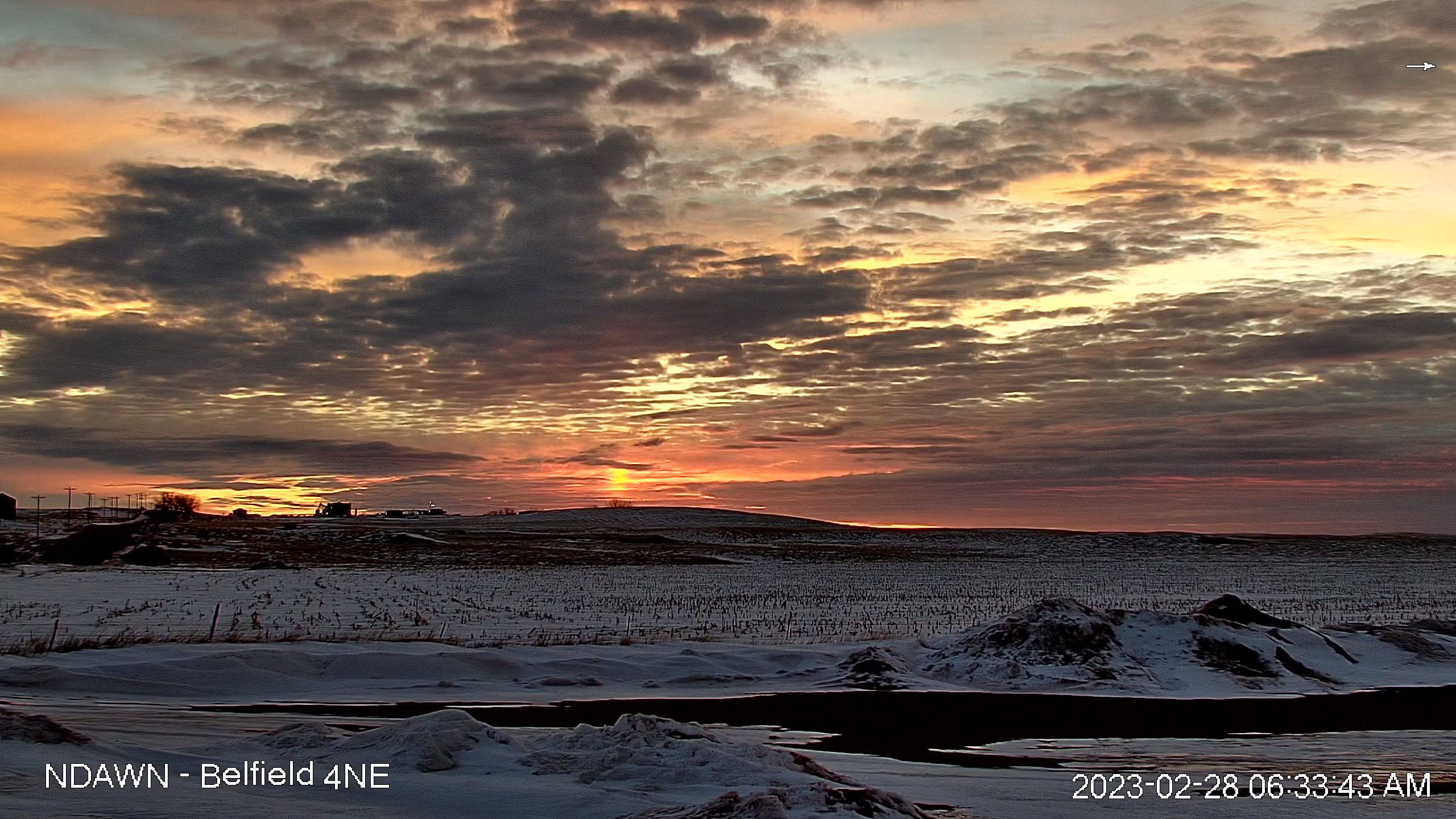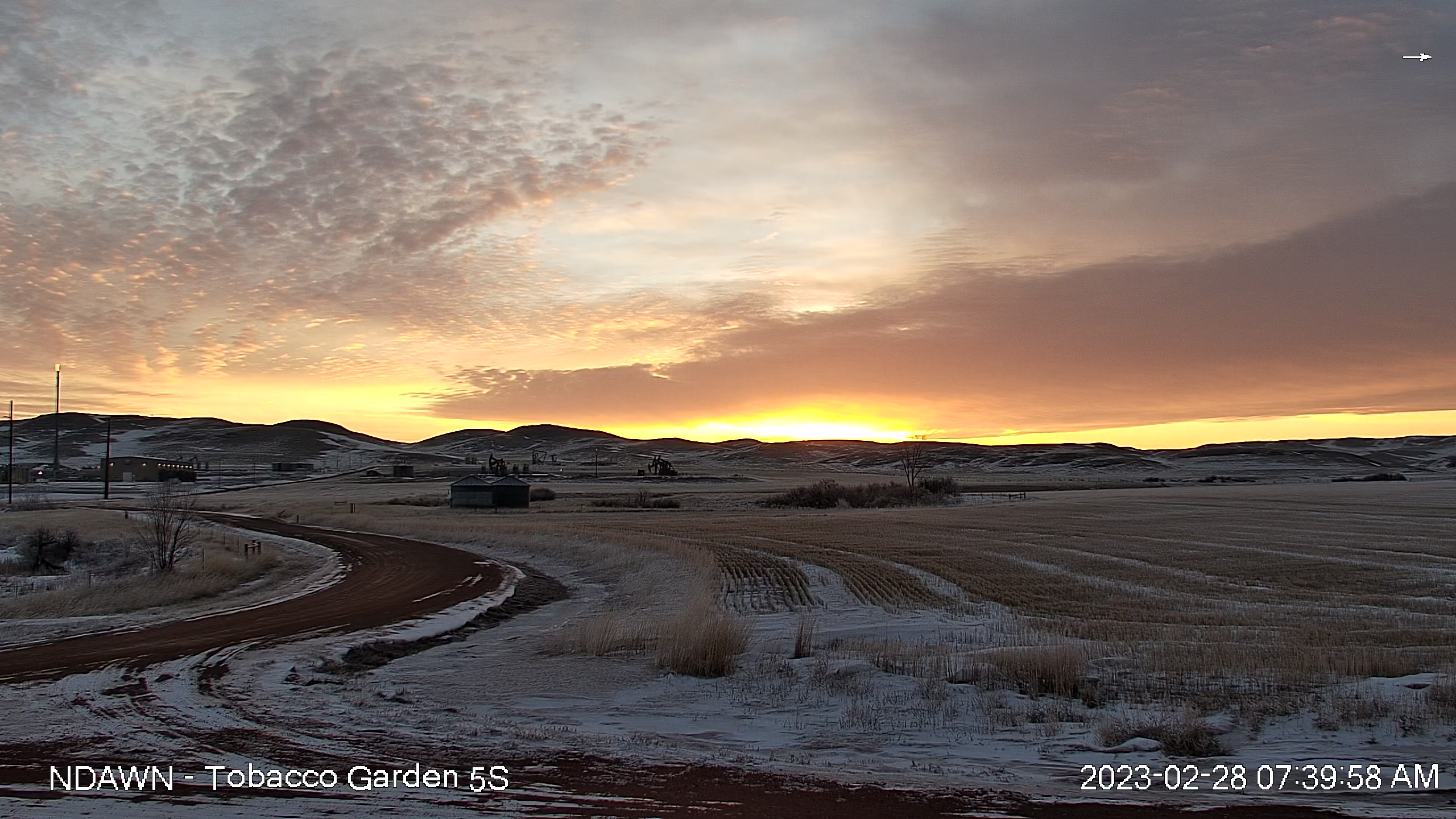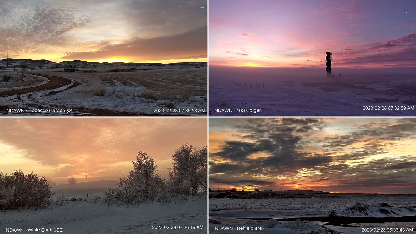 If you were fortunate enough to wake up in western North Dakota on the last day of February, you were treated to a gorgeous sunrise. The Wise Roads shots this week feature fabulous sunrises captured the morning of February 28. Images from Wise Roads cameras are updated continuously throughout the daylight hours on the Wise Roads web page. The Wise Roads project (Weather Information System to Effectively Reduce Oilfield Delays and Disruptions) was developed by WDEA to increase the efficiency of the movement of oilfield truck traffic. Most weather stations were placed in the core area of Bakken production, focusing on Dunn, McKenzie, Mountrail and Williams Counties. The project provides more accurate weather information to county road managers, especially about rain events, to minimize the need to impose weight restrictions when gravel roads get wet. It was developed in partnership with NDAWN, which maintains the stations for WDEA. The project was also assisted with a $250,000 grant from the Oil & Gas Research Council. Thus far, 48 new stations have been installed, 39 of which are located in the four core counties. Prior to the start of the project, Dunn and McKenzie Counties had just one station each, Mountrail County had three and Williams County had four. Weather station data and high resolution photos can be found at wiseroadsnd.com. Additional information is also available from NDAWN. Featured shots this week are clockwise from upper left, Tobacco Garden 5S in McKenzie County, Colgan 10S in Divide County, White Earth 2SE in Mountrail County, and Belfield 4NE in Stark County. Click on the link for a high resolution image.