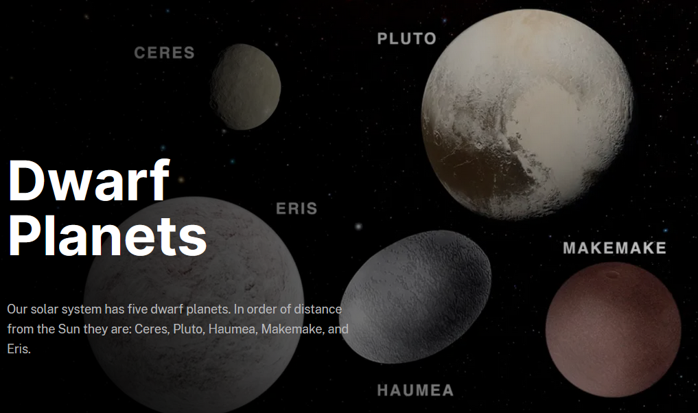 In order of distance from the Sun they are Ceres, Pluto, Haumea, Makemake, and Eris. But the IAU says there may be many more dwarf planets - perhaps more than a hundred - waiting to be discovered.
