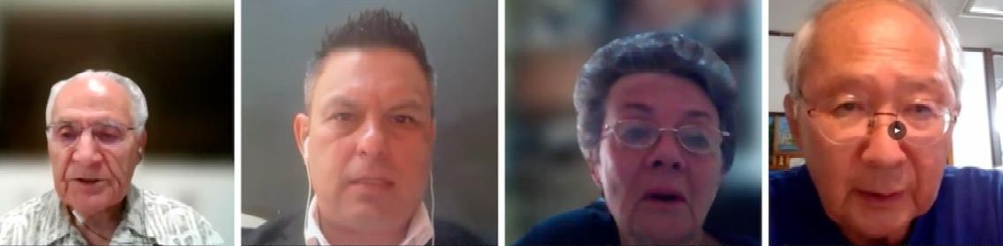 | | An International Zoom featured (L-R) Host Franco Savoia from Canada YMCA Alumni; Peter Dinsdale, YMCA Canada CEO; Alicia Sanjurjo from Buenos Aires Y retirees, and WFYR Chair Kohei Yamada. | | |